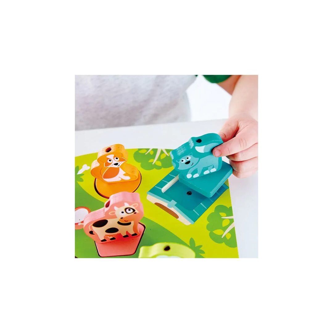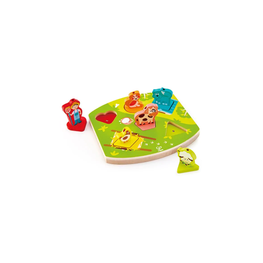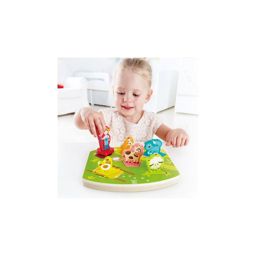 • Deze boerenerfgeluidenpuzzel bevat een houten basis met boerenerfprint en zes gekleurde en bedrukte puzzelstukken (boer, hond, kat, koe, kip en schaap).