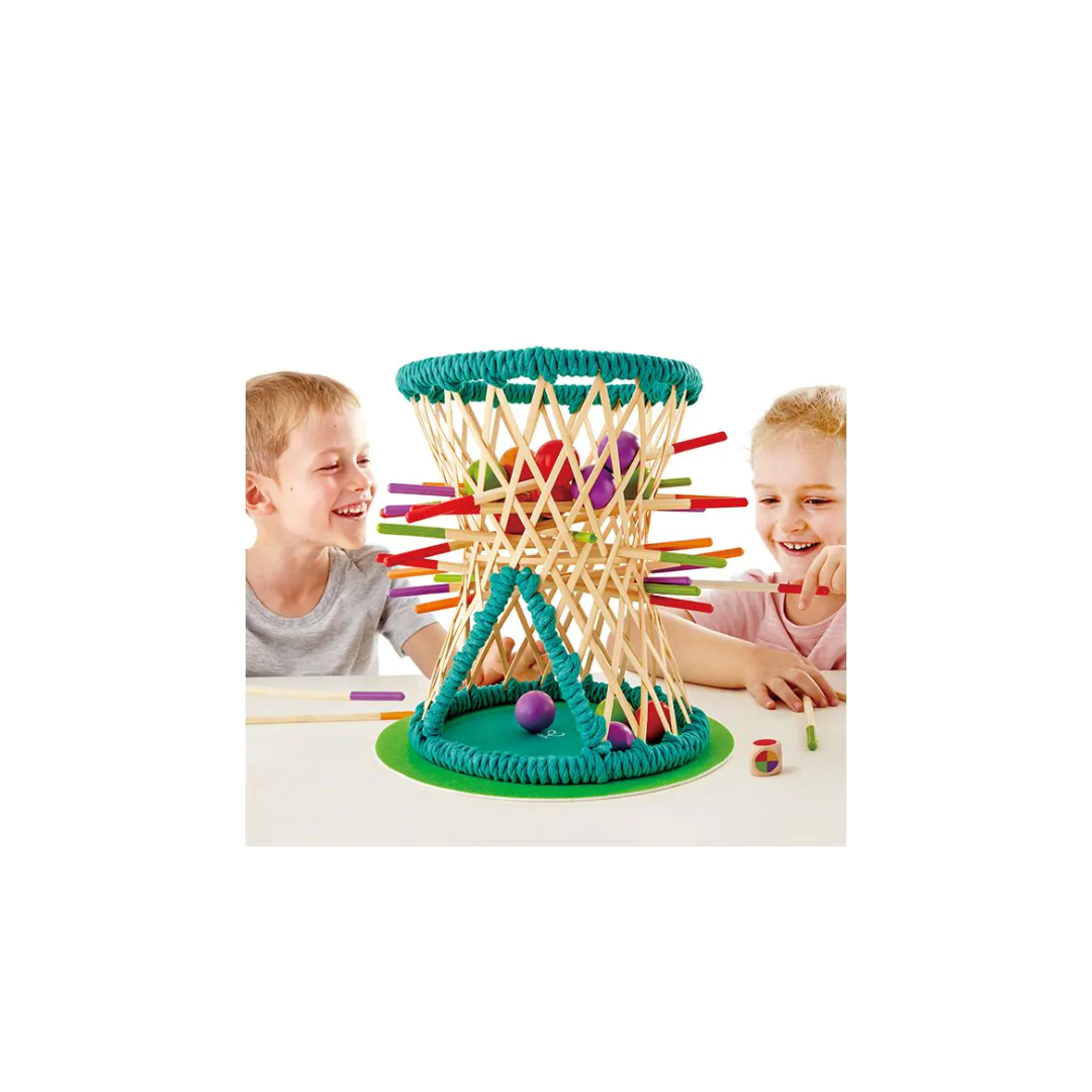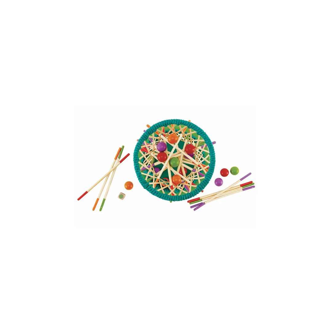 Een leuk spel waarbij je stokjes uit de vorm moet trekken zonder dat de balletjes vallen. Erg jonge spelers kunnen de stokjes en ballen sorteren en tellen.