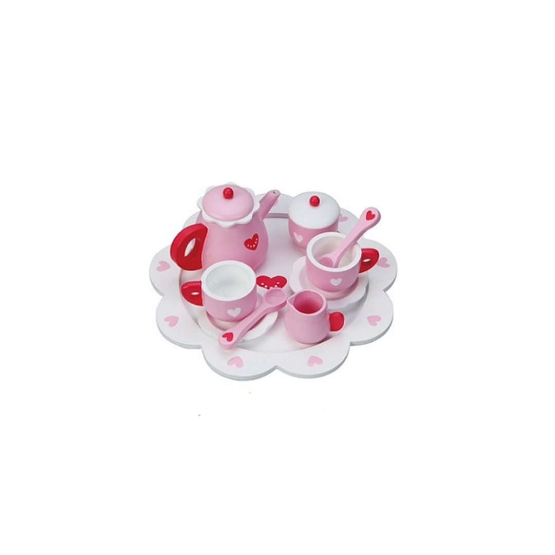Het servies bestaat uit meerdere onderdelen, waaronder een theepot, kopjes en accessoires, allemaal uitgevoerd in stevig hout en afgewerkt met lieve hartjesdetails. Ideaal voor kinderen om samen thee te drinken, rollenspellen te spelen en sociale vaardigheden te ontwikkelen.