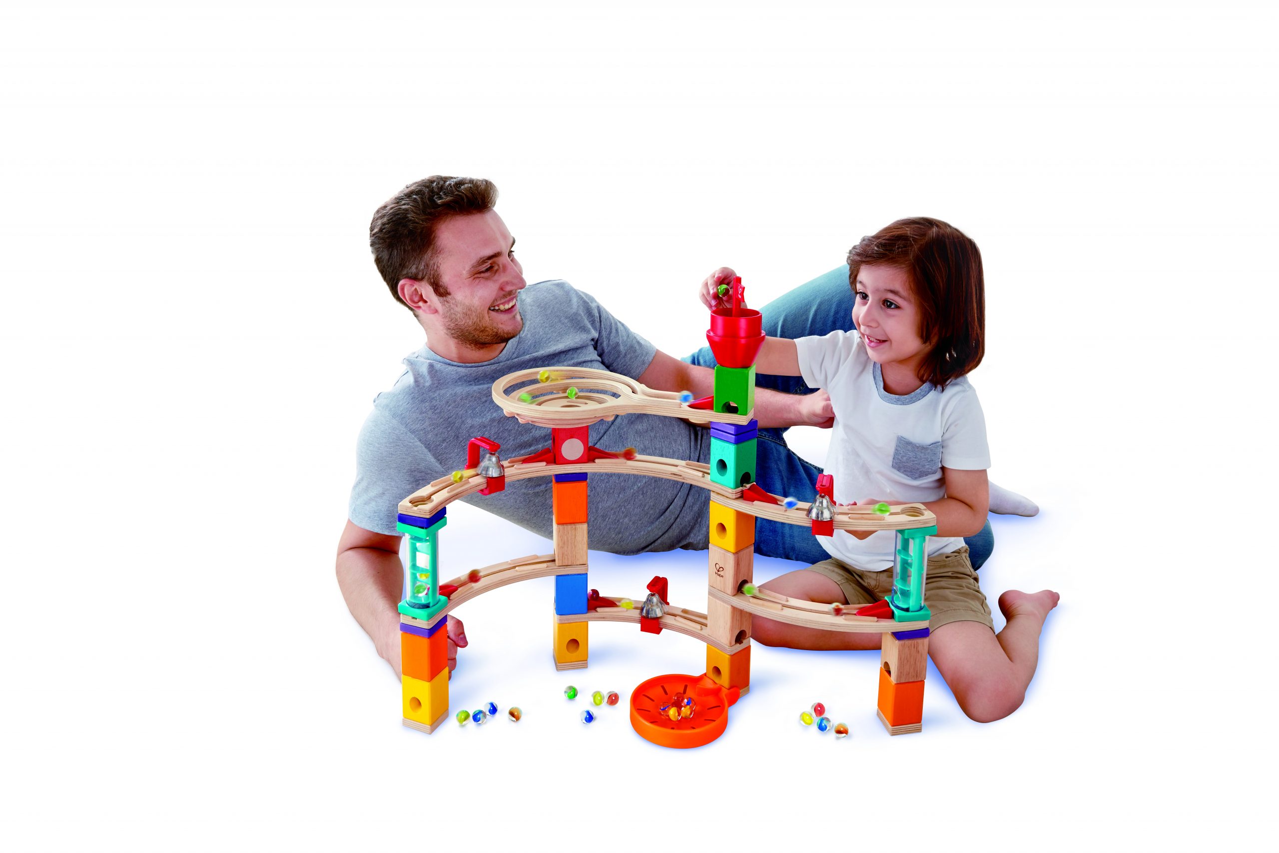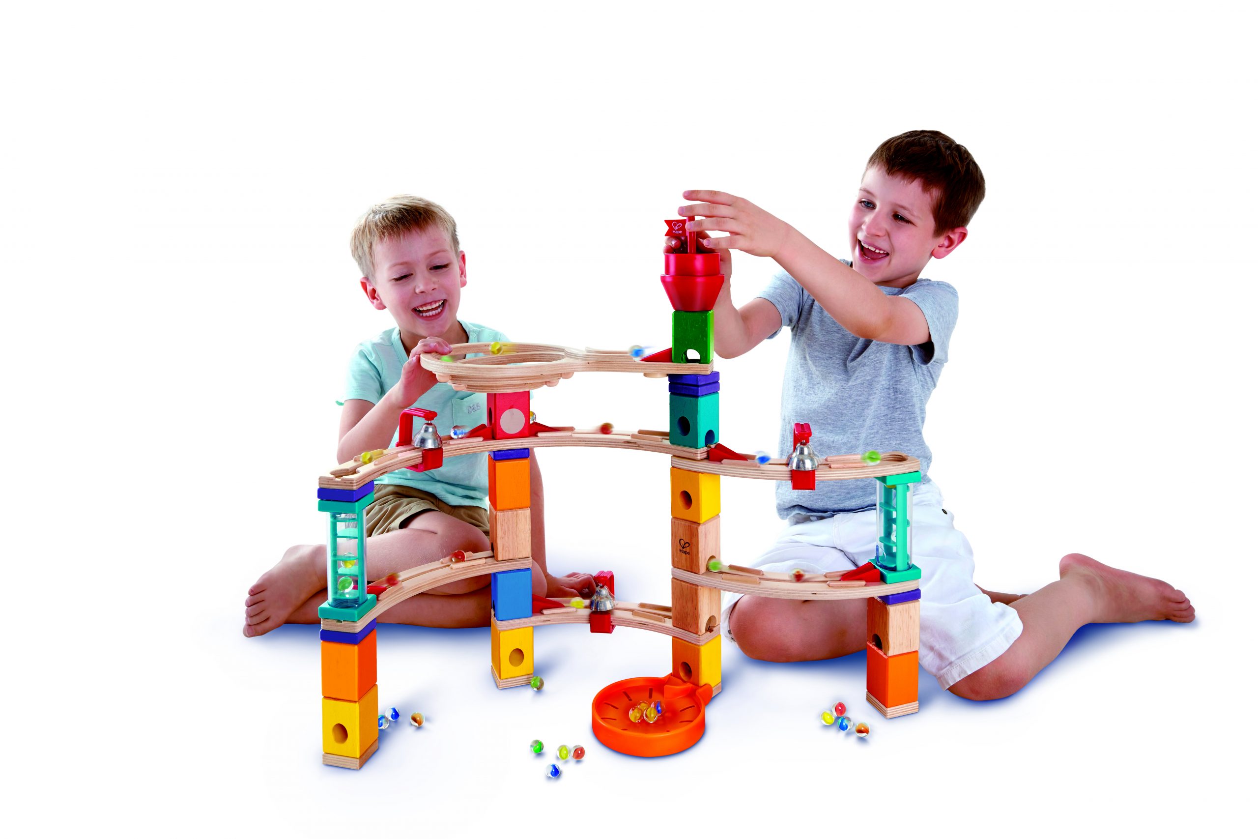 Begin met het bouwen van een van de voorbeelden die op de doos staan afgebeeld. Zie hoe je knikkers zich langs de spiraalvormige kronkel, blokken en transparante trappen navigeren en hoe ze de bellen laten klinken terwijl ze naar de vanger beneden racen. Gebruik nu je fantasie om je eigen fantastische knikkerbanen te bouwen!