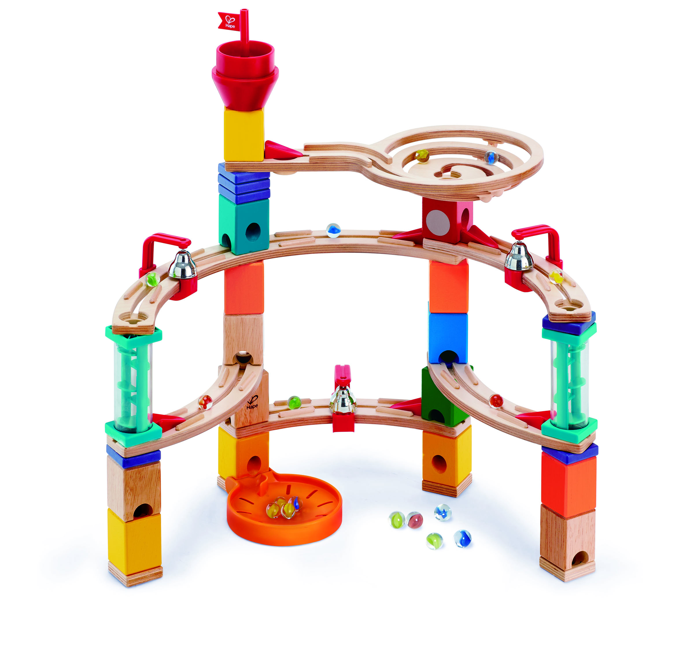 • Inclusief 15 distributieblokken, een roterende toren, 4 kleine bochten, een grote bocht, een spiraalvormige kronkel, 6 hoogteverstellers, 4 stabilisatieringen, 8 versnellers, 2 gatdichters, 2 transparante trappen, 3 bellen, 3 universele klemmen, 50 knikkers en een vanger