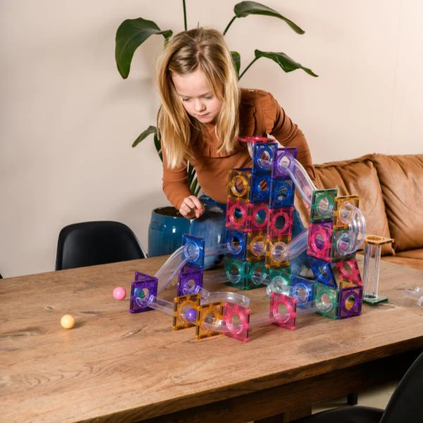 Kinderen die gek zijn van knikkerbanen zullen deze Coblo Knikkerbaan van 100 stuks in pastelkleur geweldig vinden. Met de magnetische knikkerbaan pastel van Coblo bouwen kinderen zelf hun eigen variant knikkerbaan. Iedere keer een andere constructie en deze bedenken ze allemaal zelf. De ene keer een korte knikkerbaan, de volgende keer een knikkerbaan die extra hoog is met veel bochten. Dit zorgt voor urenlang speelplezier. Magnetisch speelgoed, waarmee kinderen eindeloos kunnen bouwen en met spanning toekijken hoe snel de balletjes de eindstreep halen.