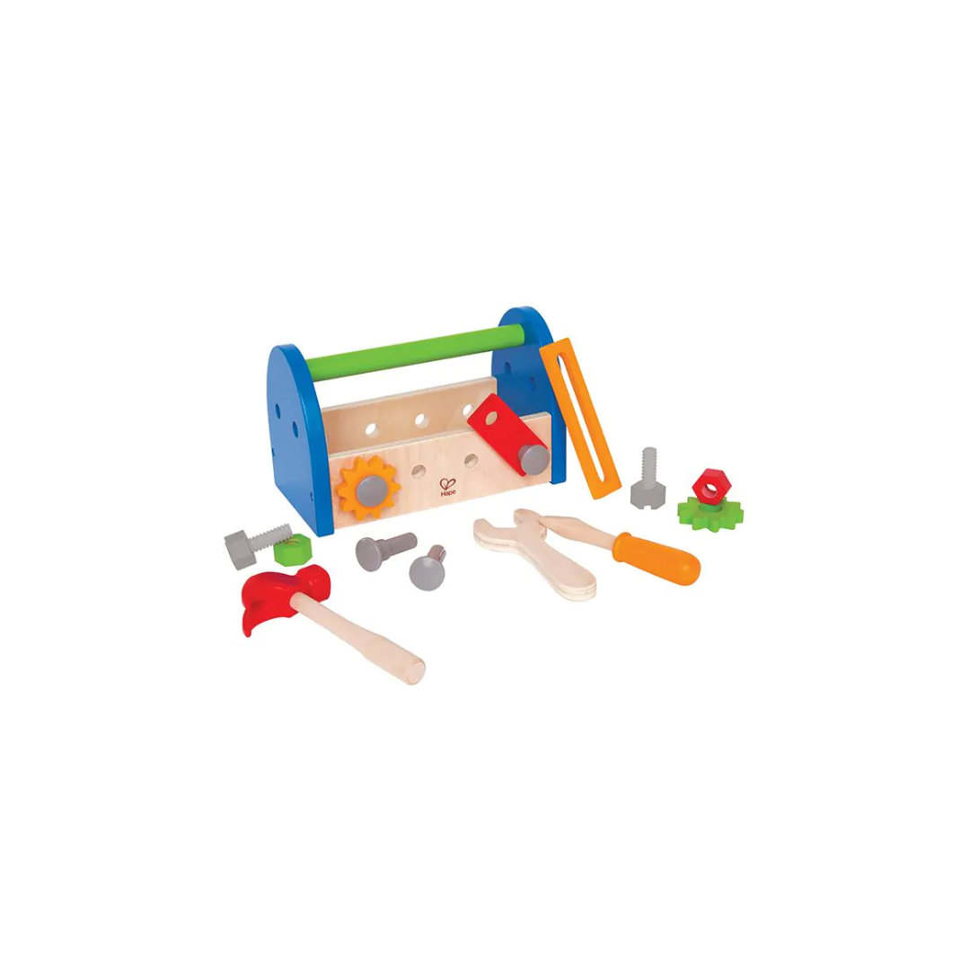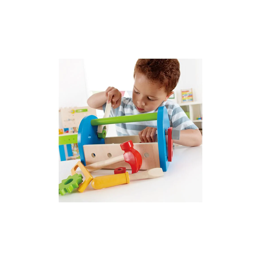 Moeren, bouten, en alle gereedschappen die kleine bouwers nodig hebben om te bouwen zijn handig opgeborgen in deze gebruiksklare kist.