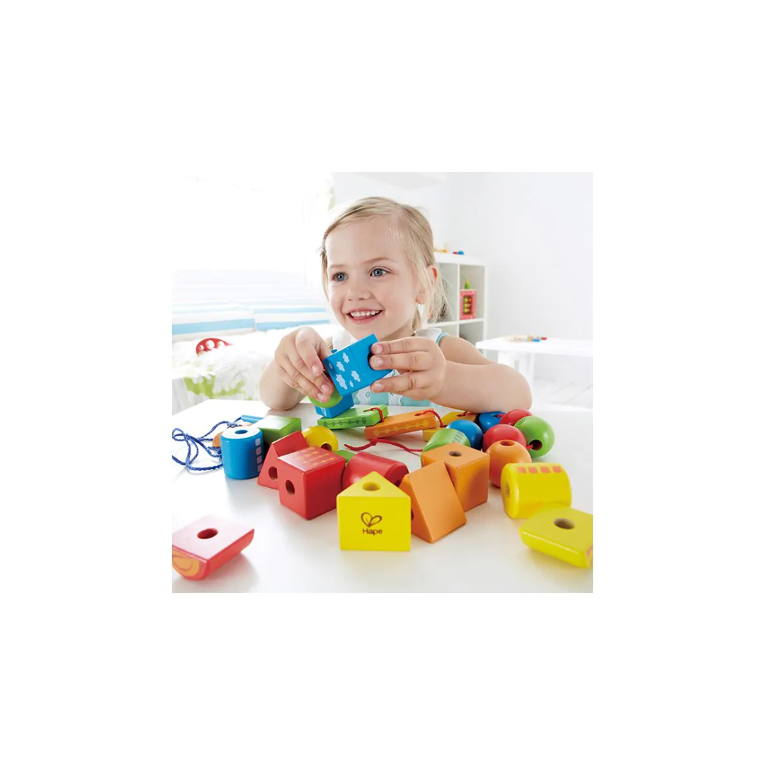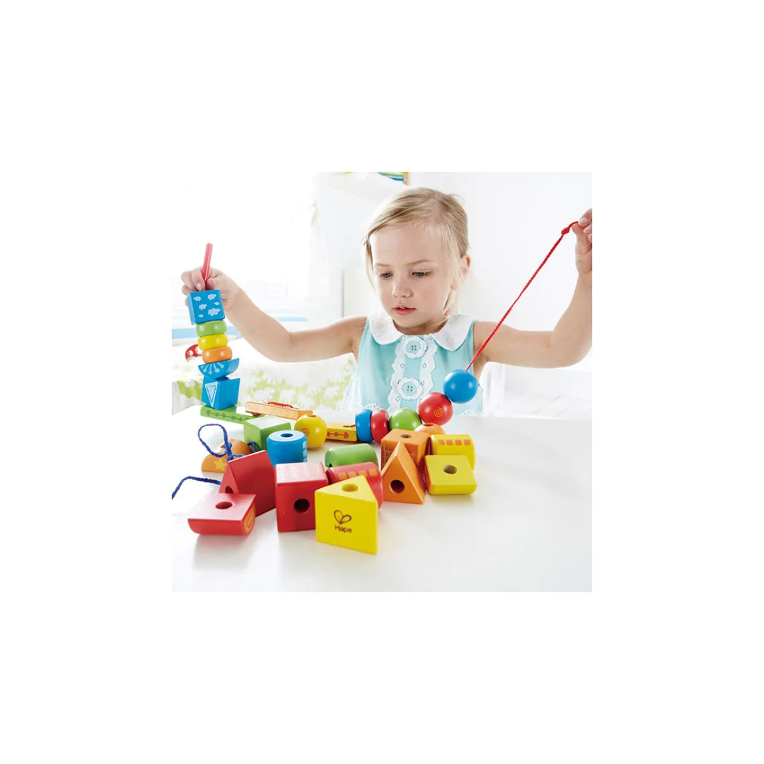 • Sorteer de blokken: op kleur, vorm of patroon. • Tel de blokken terwijl je ze op het koord rijgt.