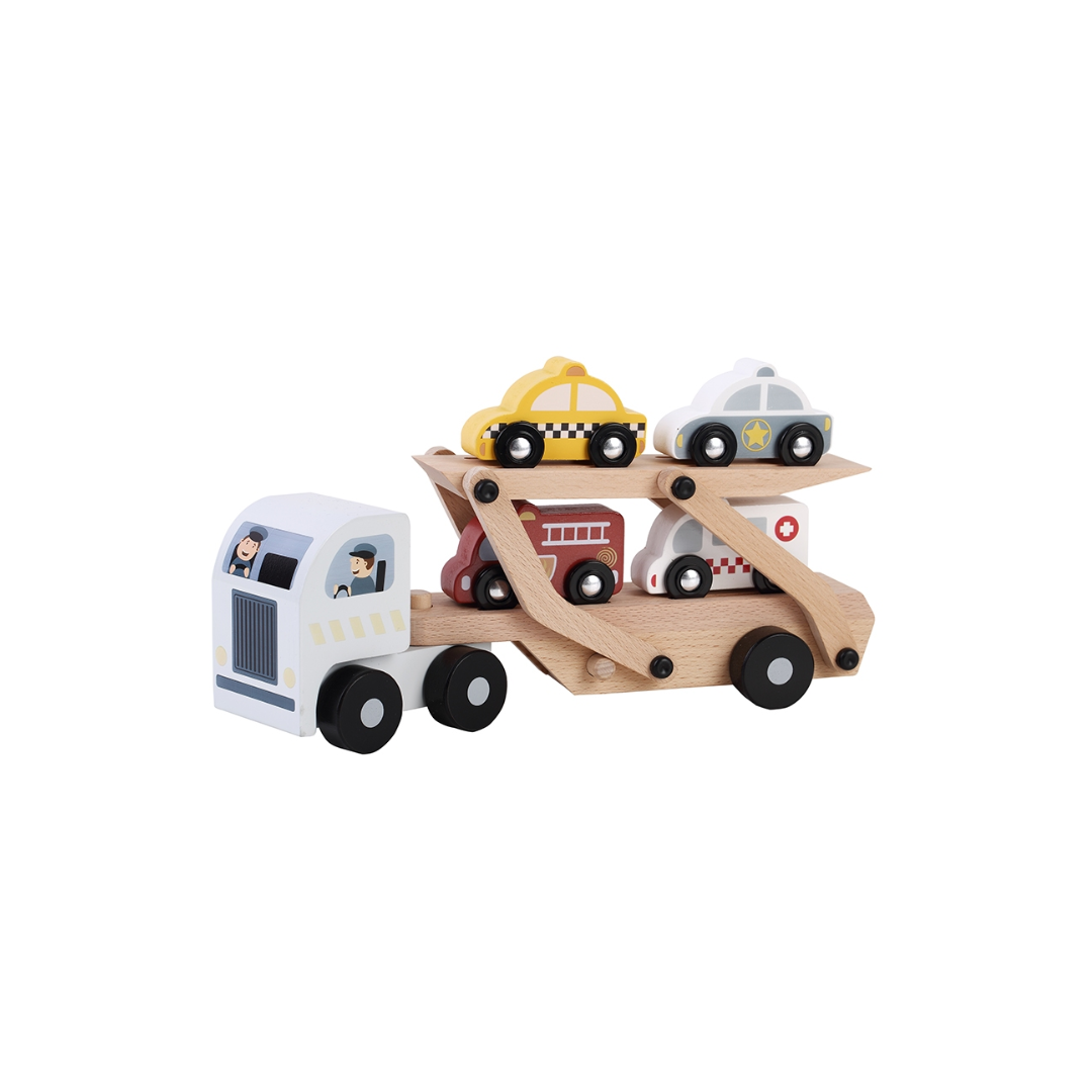 Deze houten auto transporter is een stevig en leuk speelvoertuig voor jonge autoliefhebbers. De transporter wordt geleverd met 4 kleine houten auto’s, die gemakkelijk op en af de wagen kunnen worden gereden.