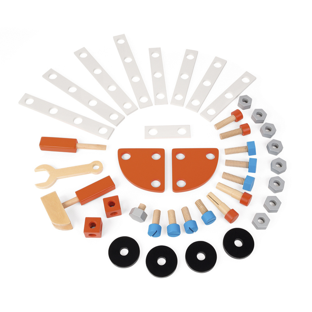 Brico’kids serie: DIY Magnetische werkbank, verstelbaar in hoogte. 40 accessoires waaronder 3 magnetische onderdelen: hamer, steeksleutel, schroevendraaier, een klok en bankschroef. Inclusief een gebruiksaanwijzing om met de accessoires een raceauto te maken! Maximale werkhoogte 50,7 cm. Geschikt voor kinderen van 3-8 jaar.