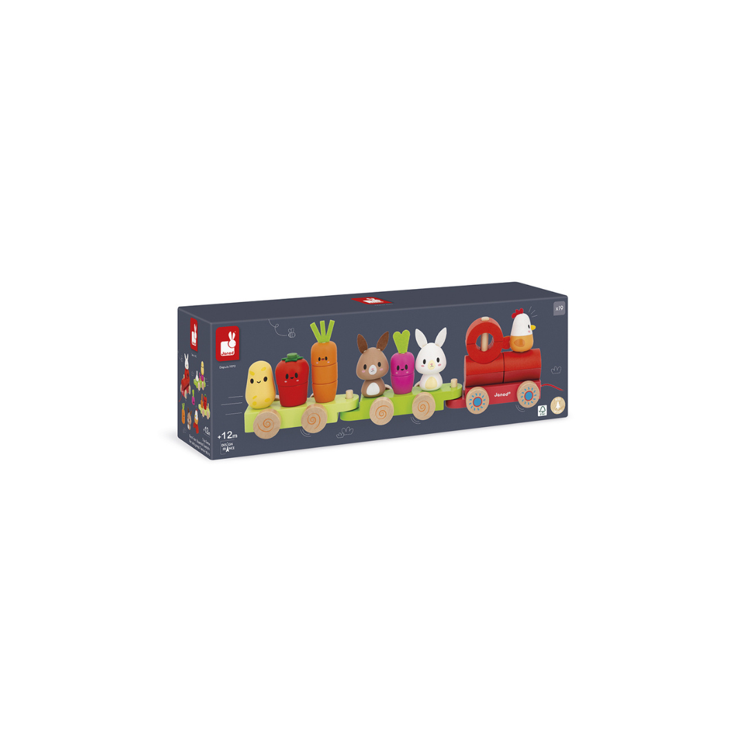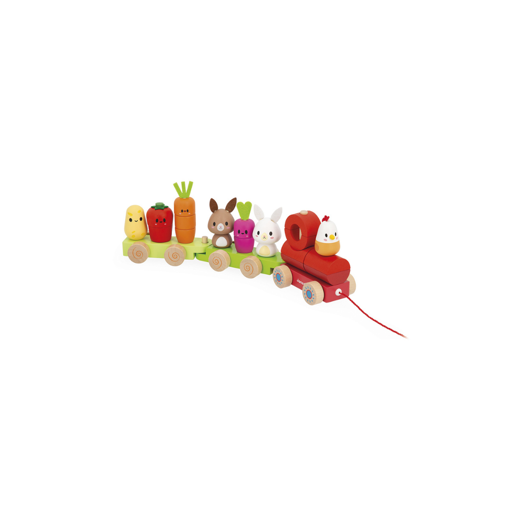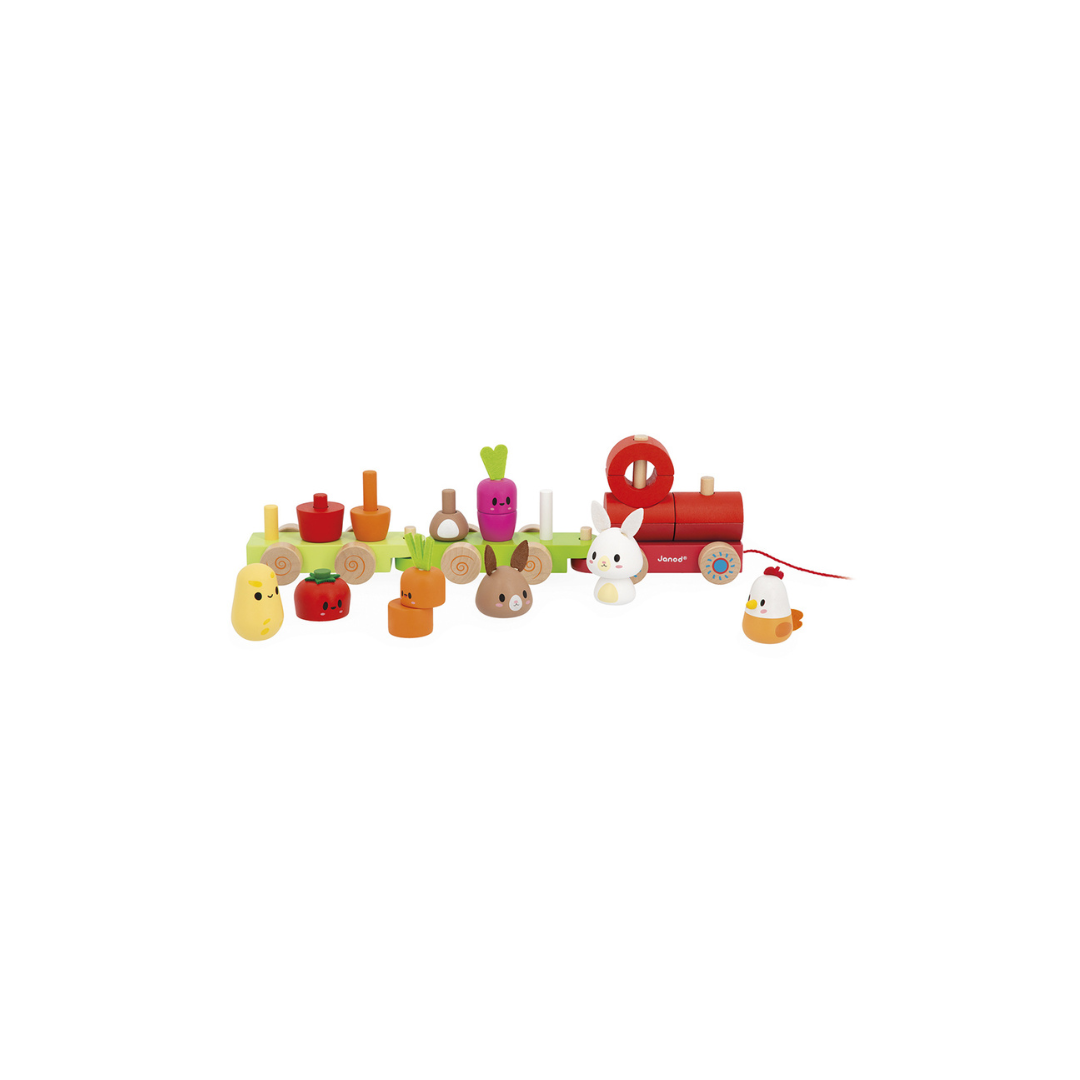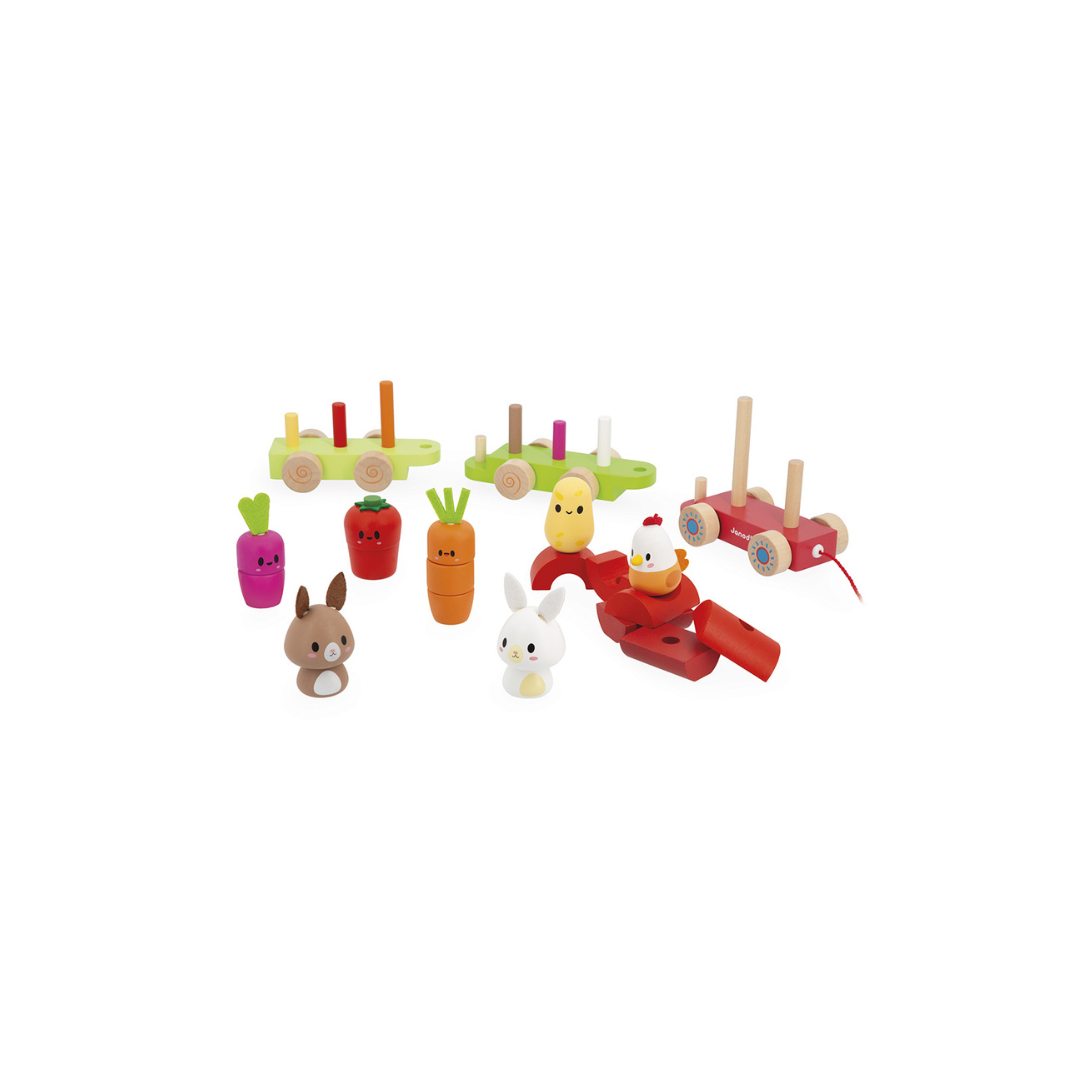 Tjoek! Tjoek! Laat de kleine boerderijtrein passeren met zijn groenten en kleine dieren! Mooie houten trein uit 3 wagons met 19 stukken om in elkaar te zetten voor het maken van groenten (aardappel, tomaat, wortel en radijs) en boerderijdieren (konijnen en kip). Deze activiteit ontwikkelt de fijne motoriek bij de allerkleinsten, terwijl de grotere kinderen hun grove motoriek ontwikkelen door de hele trein met behulp van het koord vooruit te trekken.
