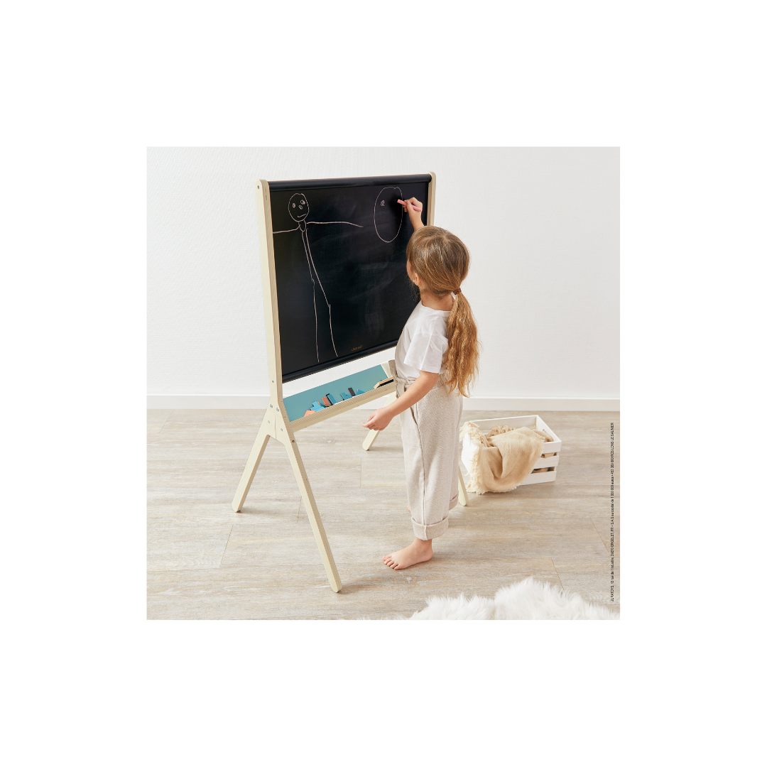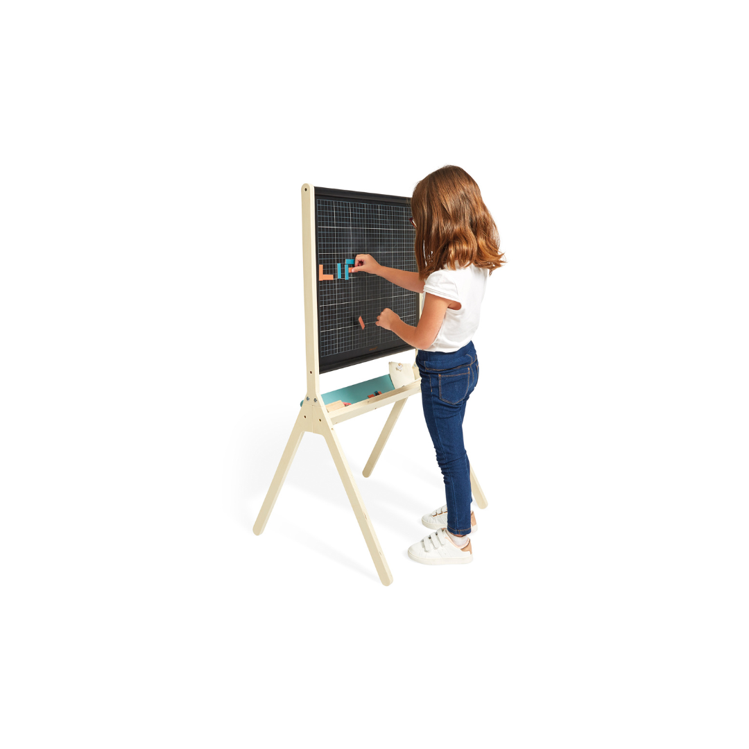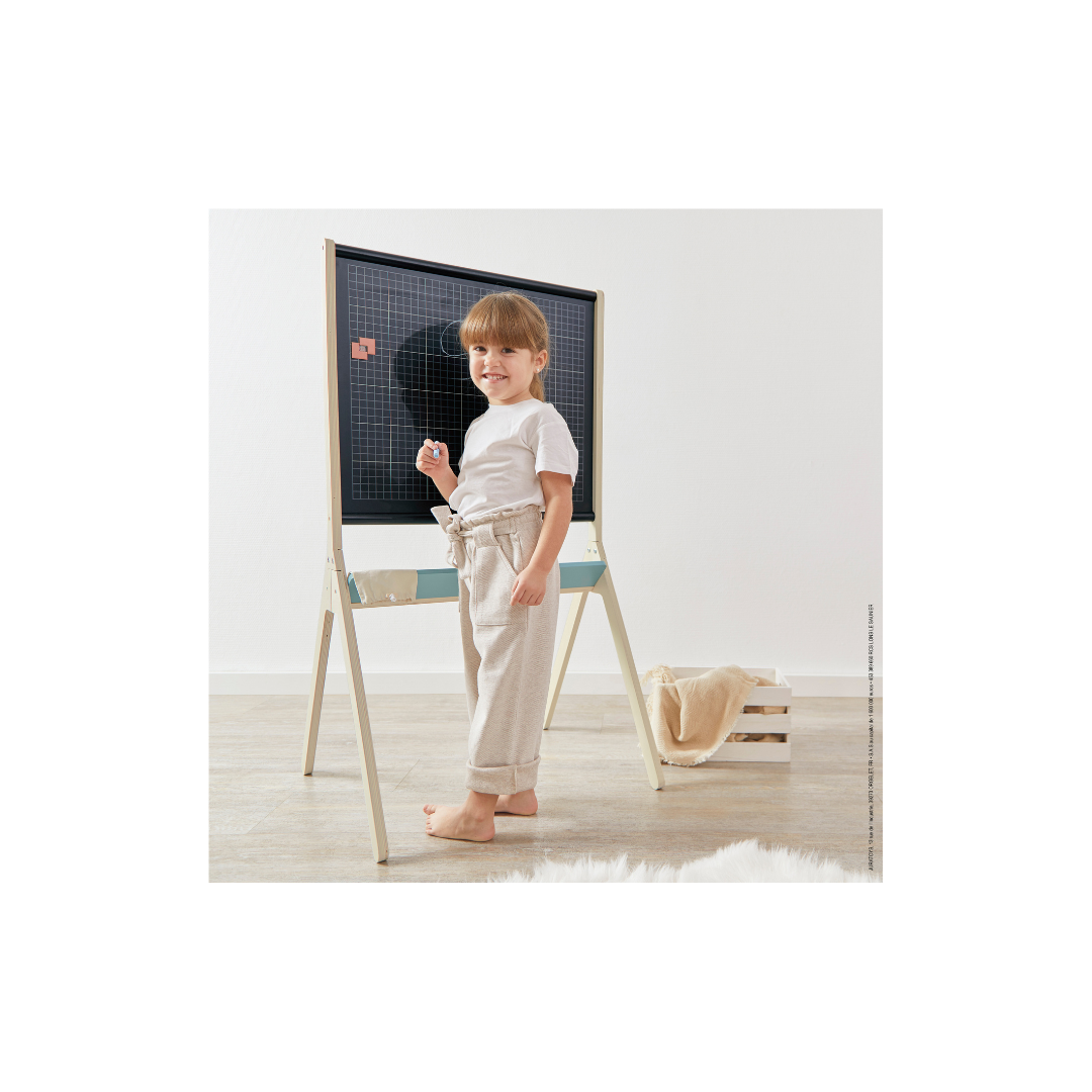 Dit zwarte schoolbord in een trendy designlook behaagt zowel klein als groot! Het bord bestaande uit twee kanten, een zwarte bordkant en een gerasterde magneetkant, bieden vele manieren om te spelen. Er zijn 3 krijtjes en een wisser meegeleverd om eindeloos op het zwarte bord te tekenen en het te wissen. Het raster is aan de andere kant ideaal om het kind zijn eerste letters te laten schrijven.