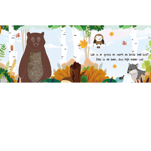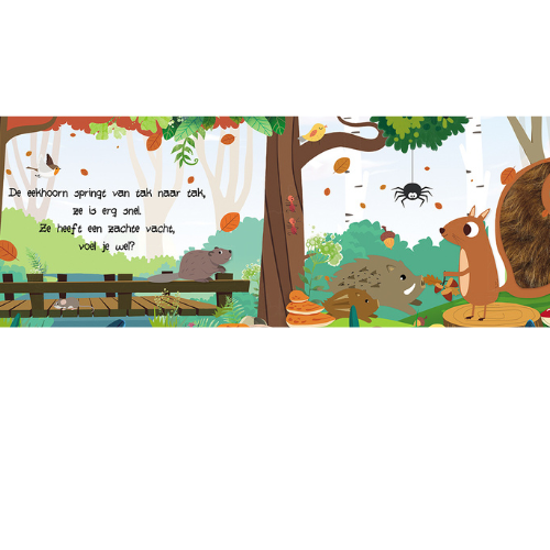Welke dieren leven er in het bos? In dit boekje leer je ze kennen, maar kun je ze ook aaien! Voel maar eens aan de vacht van het hert, de stekels van een egel of de staart van de eekhoorn. Stevig boekje voorzien van mooie illustraties en stofjes en lieve rijmpjes om voor te lezen maar waarmee je kindje ook zelf kan spelen en ontdekken.