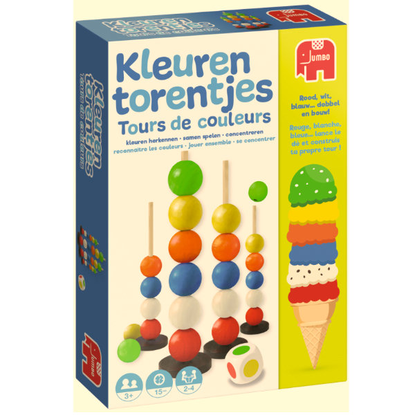 We gaan ons kleuren torentje opbouwen door deze kleuren te gooien met de kleurendobbelsteen. Jonge kinderen leren zo spelenderwijs kleuren herkennen en benoemen.