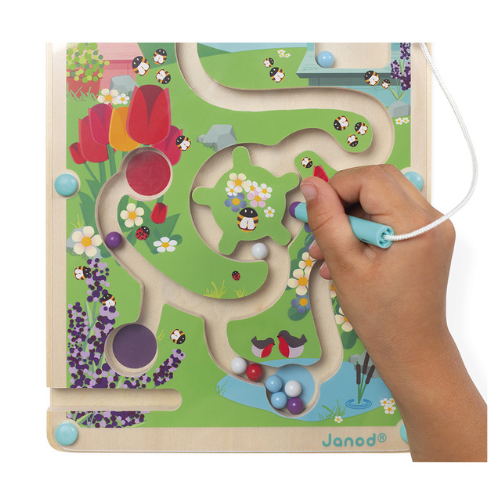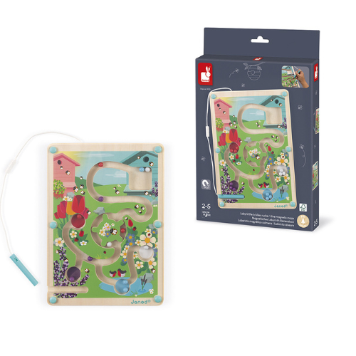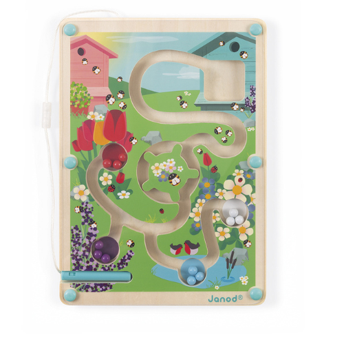 Ga vanaf de bijenkorf door het doolhof en breng de 12 gekleurde knikkers naar hun overeenkomstige zone met behulp van de magneetpen: blauw voor de plas, rood voor de tulpen, etc… Neem het draaihek echter goed zodat je niet vast komt te zitten! FSC-gecertificeerd. 2-5 jaar.
