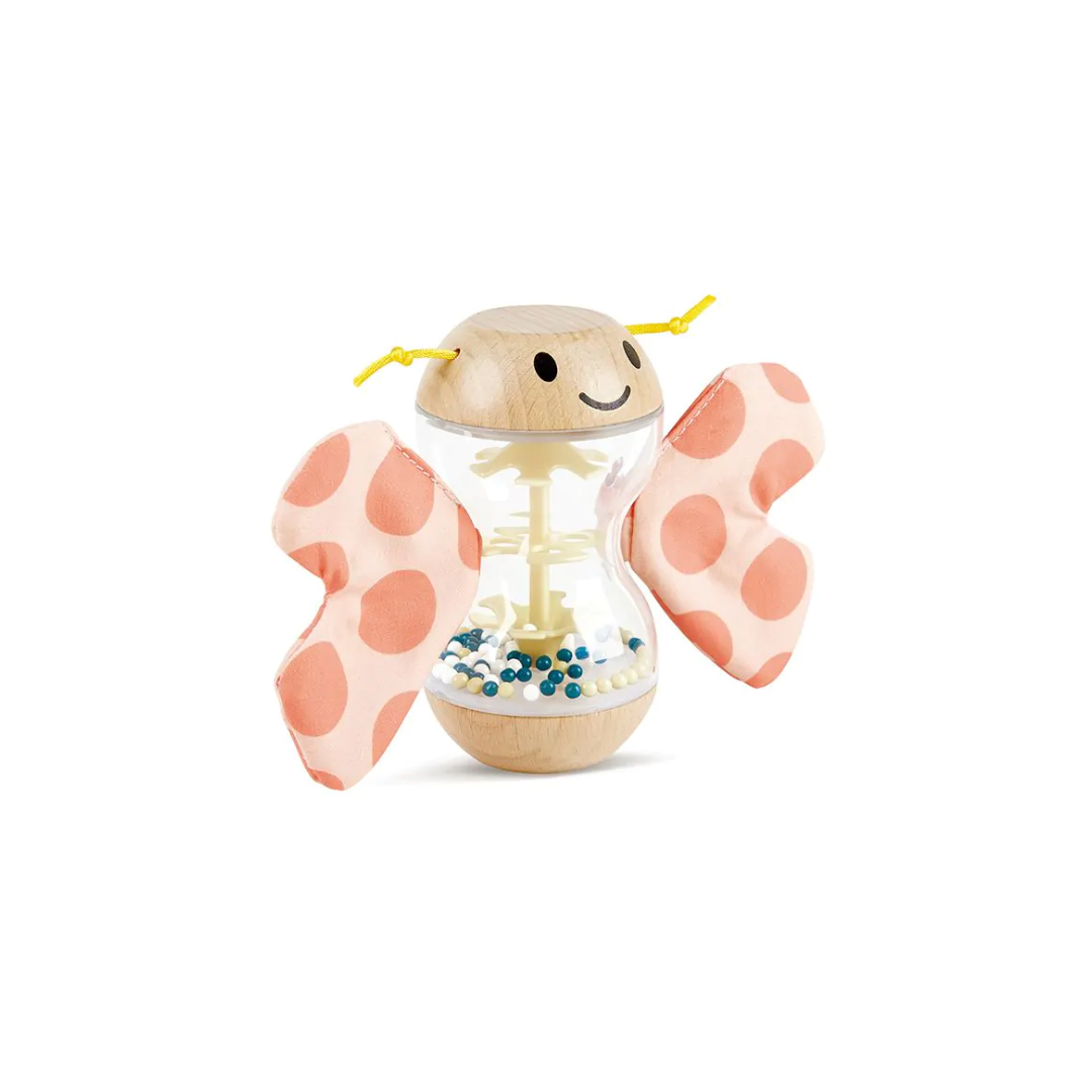 De regenmaker in de vorm van een vlinder zorgt met de langzaam rollende kralen en de regendruppelgeluiden voor een glimlach op het gezicht van je kindje. De regenmaker heeft een eenvoudige grip, waardoor de regenmaker makkelijk in een schuddende en rammelende activiteit te veranderen is. Daarnaast knisperen de vleugels en kunnen deze er ook af gehaald worden.