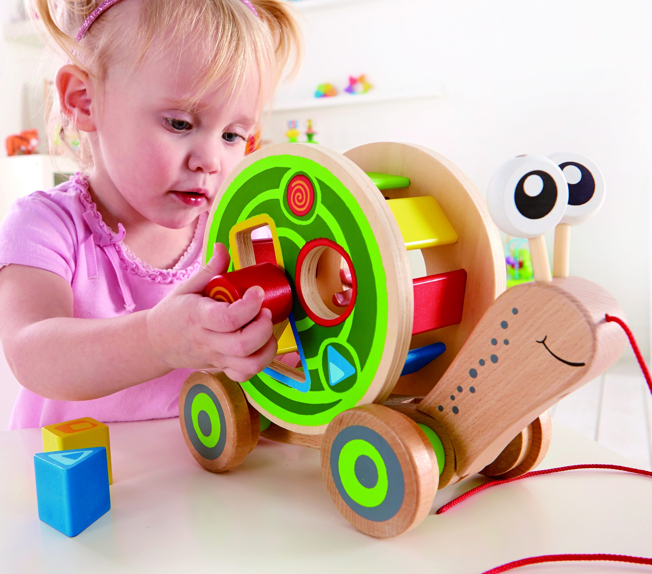 Noem alle kleuren op de slak en zijn slakkenhuis. Breng de gekleurde vormen in overeenstemming met de gekleurde latten op het slakkenhuis. Stel de blokken op en trek de slak door het “doolhof.” Gebruik woorden zoals “trekken” en “duwen” om de handelingen van je kind te beschrijven.