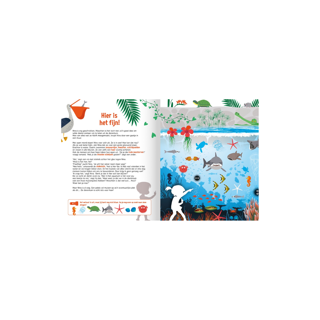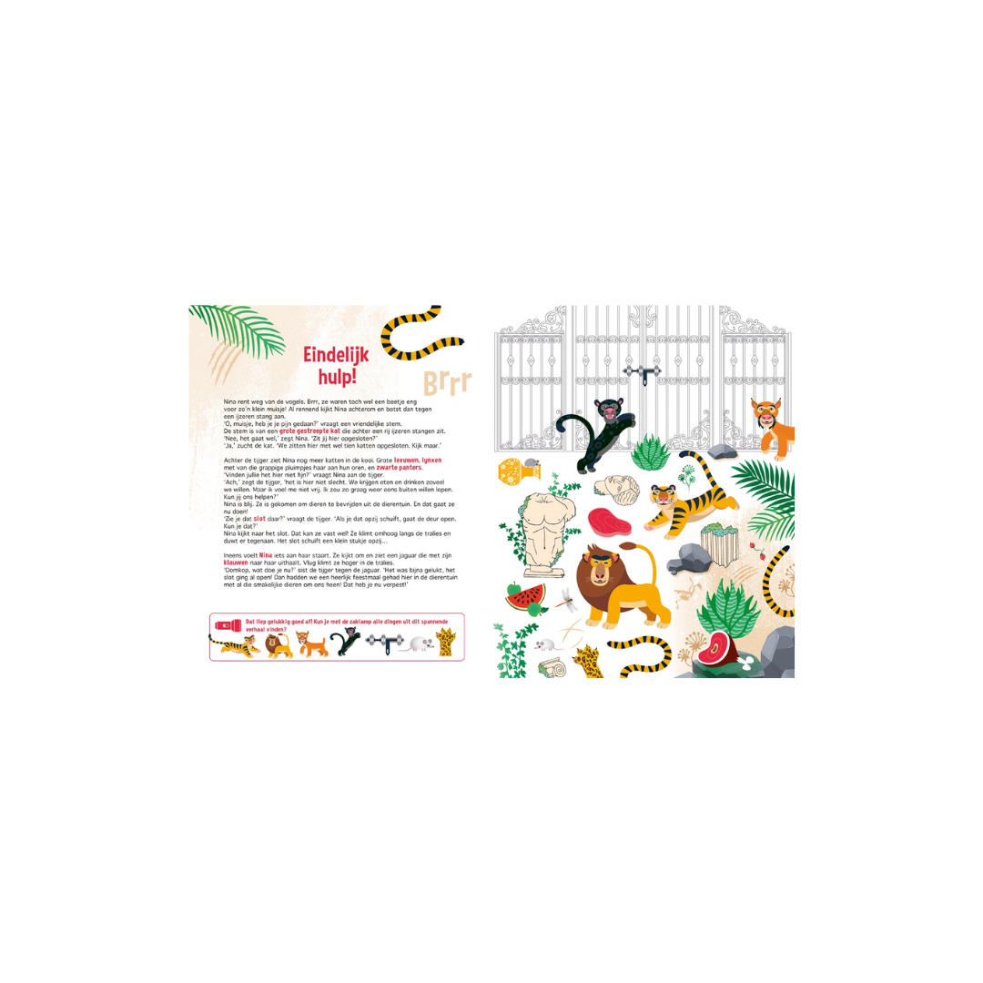 Het boek begint met leuke weetjes en feitjes over de dierentuin. Hier kom je ook de kartonnen zaklamp tegen. Deze zaklamp heb je nodig voor de pagina’s die volgen. In het verhaal staan namelijk gekleurde woorden, die je op de rechterpagina kunt zoeken. Maar dat lukt alleen als je de zaklamp gebruikt! Schuif ‘m onder de zwarte pagina en je ziet dat er een lichtbundel ontstaat, waarmee je kunt zien wie Nina allemaal tijdens haar reis tegenkomt.