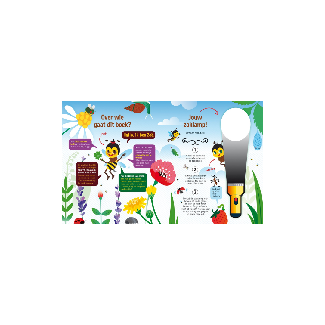 Het boek begint met leuke weetjes en feitjes over bijen. Hier kom je ook de kartonnen zaklamp tegen. Deze zaklamp heb je nodig voor de pagina’s die volgen. In het verhaal staan namelijk gekleurde woorden, die je op de rechterpagina kunt zoeken. Maar dat lukt alleen als je de zaklamp gebruikt! Schuif ‘m onder de zwarte pagina en je ziet dat er een lichtbundel ontstaat, waarmee je kunt zien wat Zoë allemaal tijdens haar reis tegenkomt.