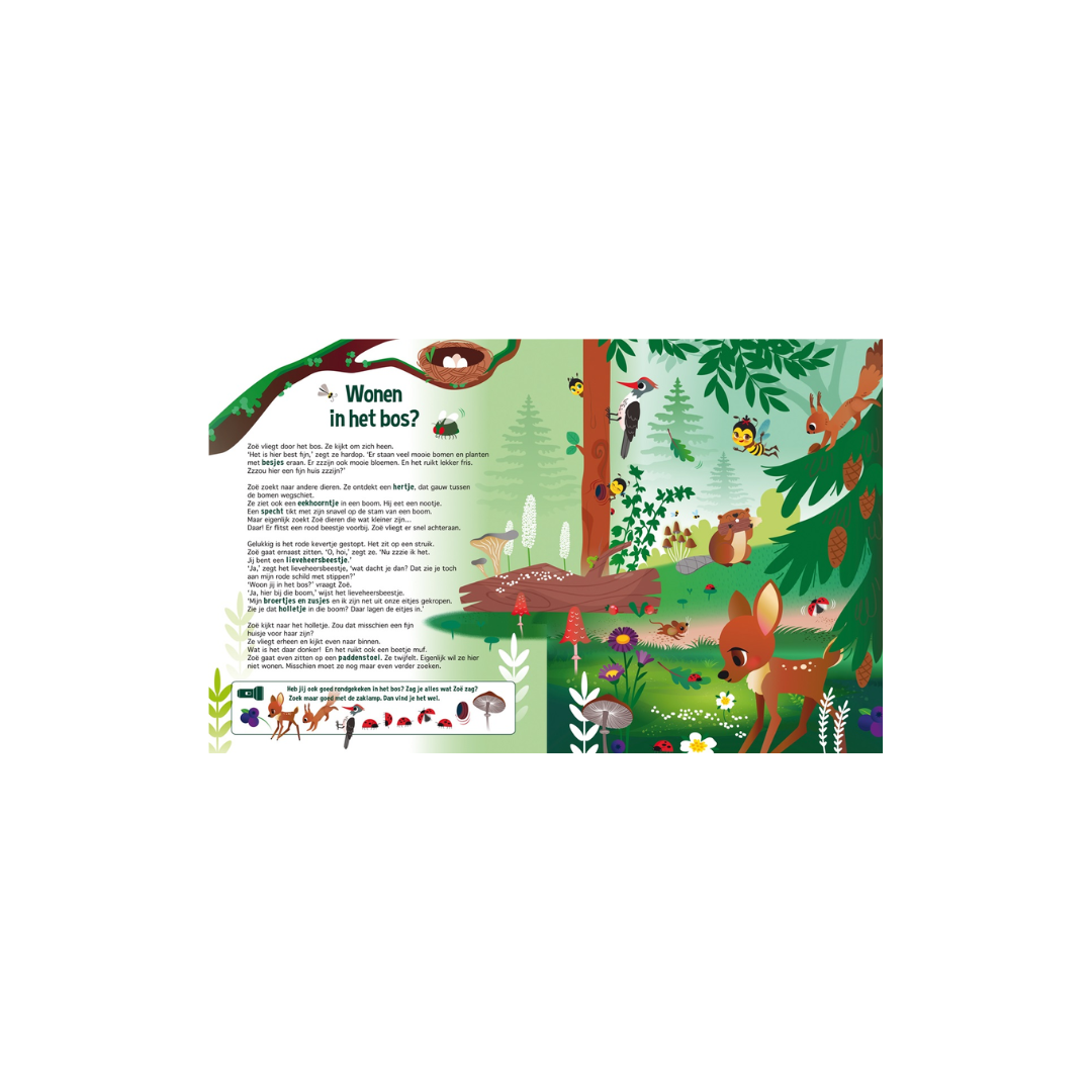 Bijtje Zoë is op zoek naar een plekje om te wonen. Ze vliegt langs lieveheersbeestjes, vlinders en mieren om te zien hoe zij wonen. Maar wat is nou een fijn huis voor een bij? Help jij mee met zoeken?