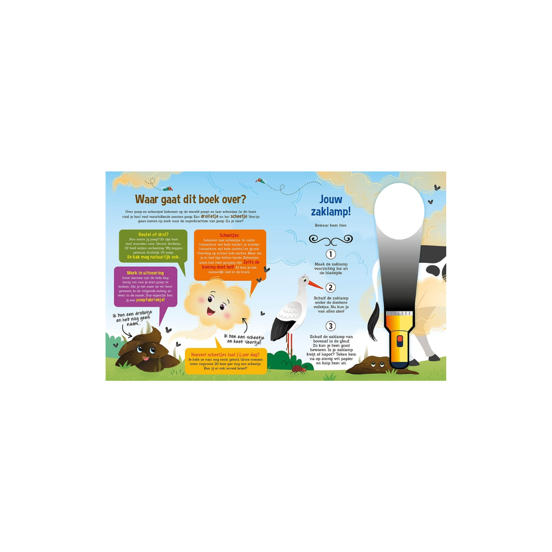 Het boek begint met leuke weetjes en feitjes over poep en scheetjes. Hier kom je ook de kartonnen zaklamp tegen. Deze zaklamp heb je nodig voor de pagina’s die volgen. In het verhaal staan namelijk gekleurde woorden, die je op de rechterpagina kunt zoeken. Maar dat lukt alleen als je de zaklamp gebruikt! Schuif ‘m onder de zwarte pagina en je ziet dat er een lichtbundel ontstaat, waarmee je kunt zien wat scheetje Veertje en het drolletje allemaal tijdens hun reis tegenkomen.