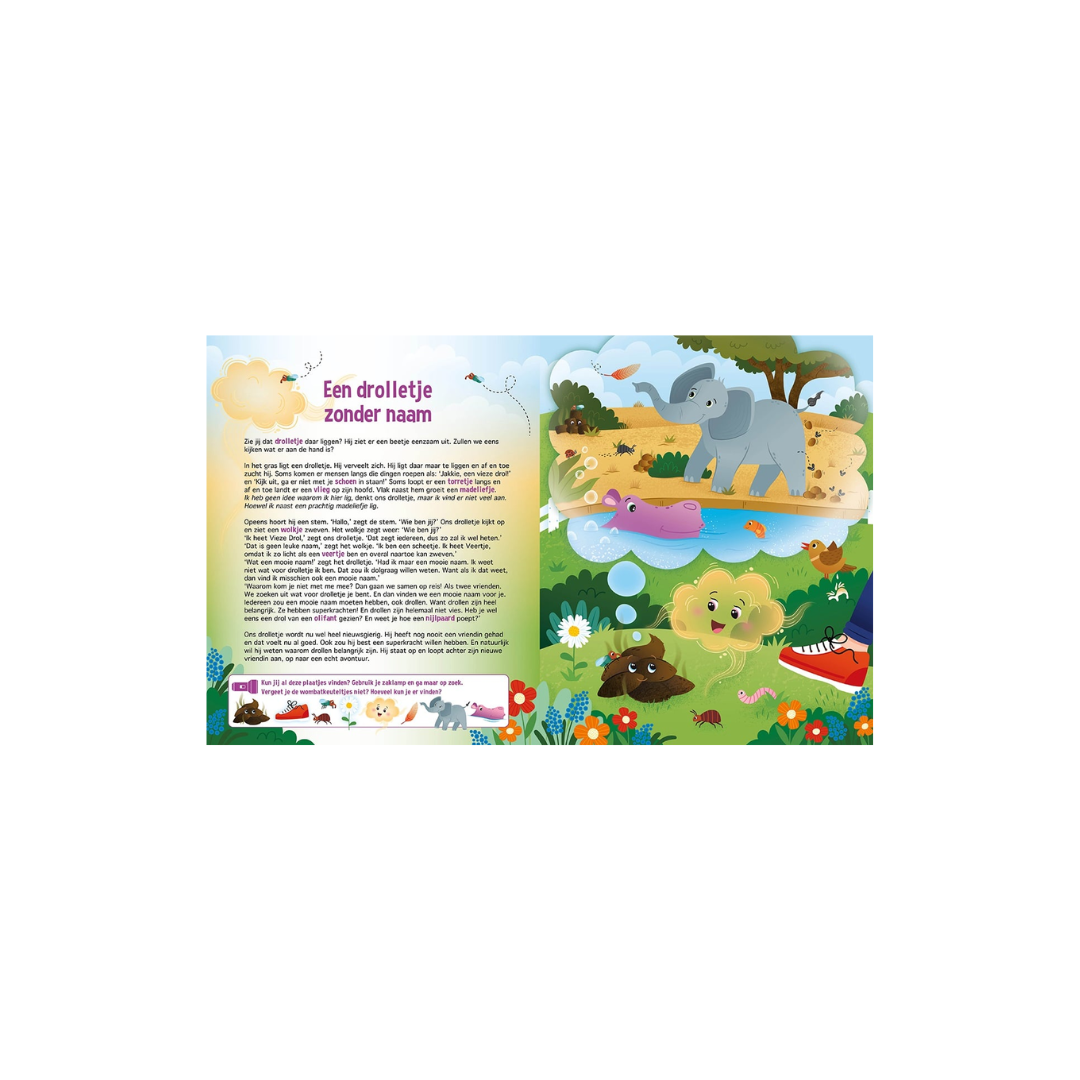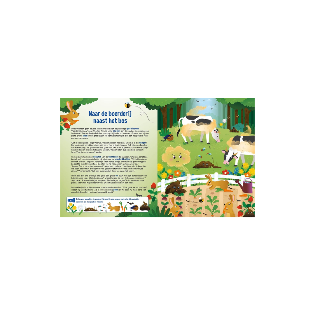 Scheetje Veertje en het drolletje zonder naam gaan samen op pad. Alle keuteltjes, vlaaien en drolletjes die ze tegenkomen in het bos, op de boerderij en zelfs onder water blijken een superkracht te hebben! Ga jij met hen mee op reis?