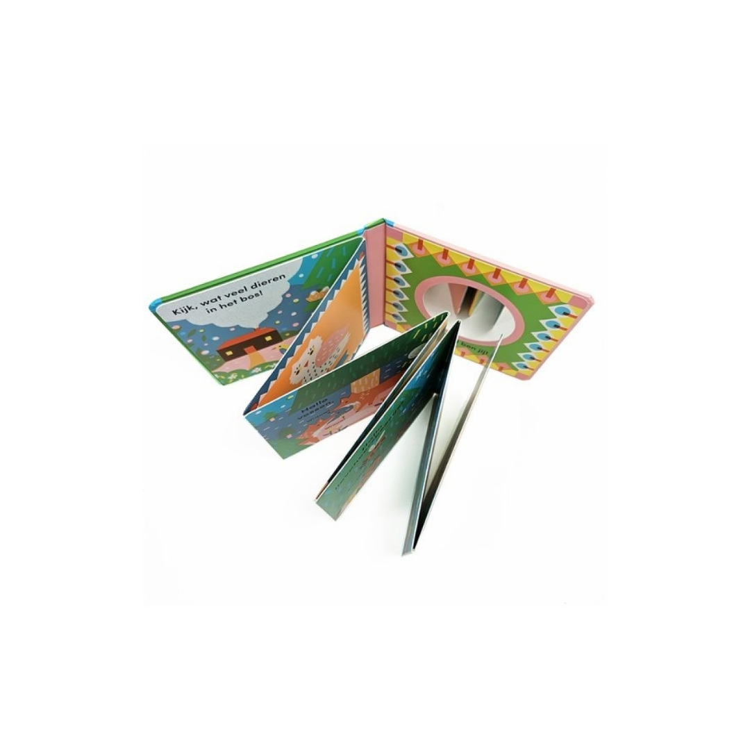 Het kleurrijke en interactieve babyboekje ‘Tummy Time in het bos’ is een ideaal hulpmiddel voor buiktijd of ’tummy time’. Dit boekje is speciaal ontworpen voor baby’s en kan als een harmonica worden uitgevouwen, plat op de vloer gelegd worden of rechtop in de box worden gezet. Hierdoor is het een perfect instrument voor tummy time, waarbij baby’s als ze wakker zijn op hun buik liggen om hun armen, rug en nekspieren te versterken, zoals wordt aanbevolen door experts van het consultatiebureau. De felle kleuren van het bos en de dierengezichten stimuleren het gezichtsvermogen en op die manier houden de vrolijke illustraties van Louise Lockhart zelfs de aandacht van de meest beweeglijke baby’s vast.