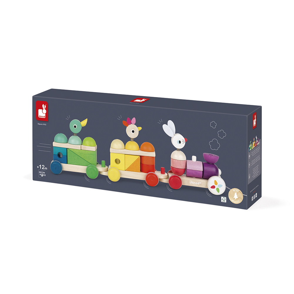 Janod Zigolos Grote Trein is een kleurrijk, houten duw- en stapelspeelgoed dat jonge kinderen uitnodigt tot ontdekken, bouwen en spelen!